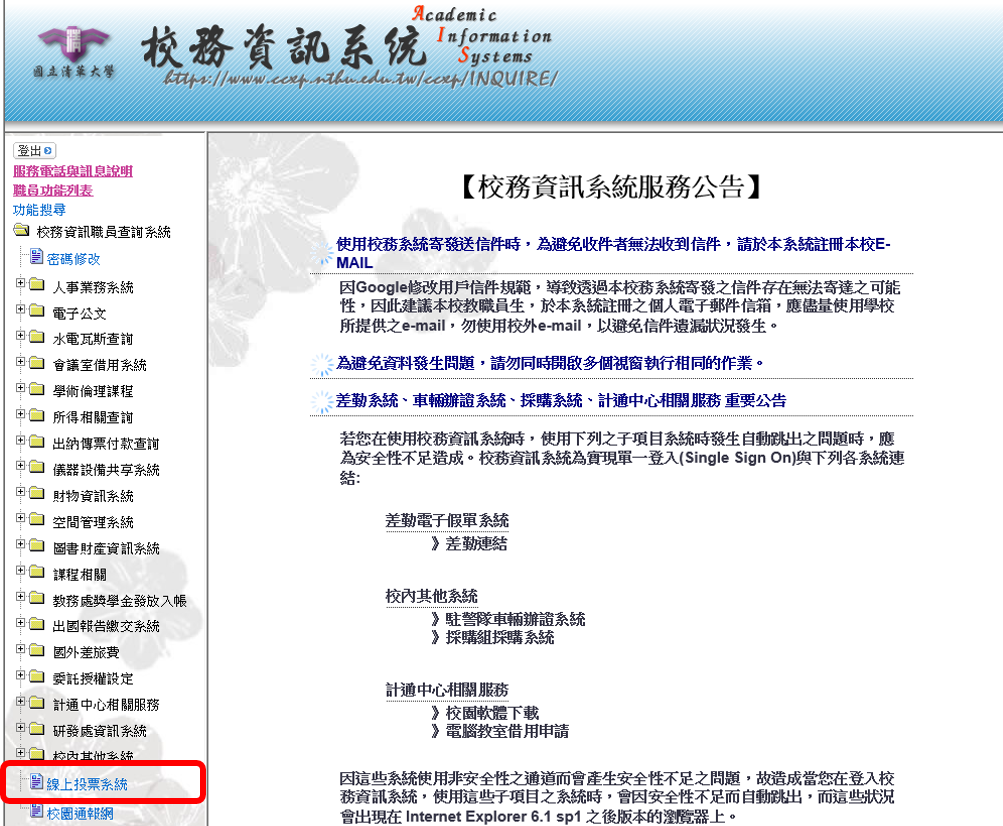 投票連結請登入「校務資訊系統」進入「線上投票系統」。